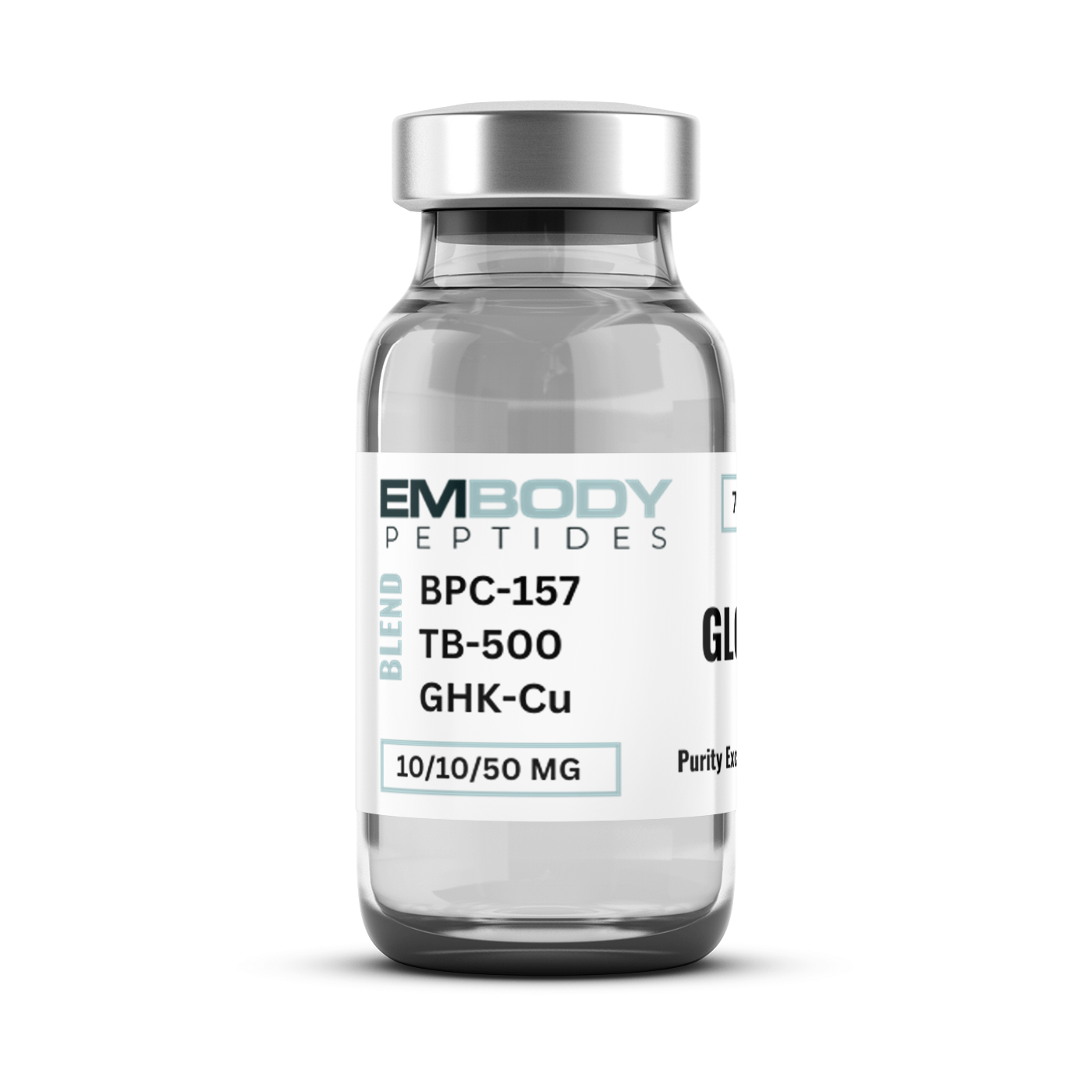 GLOW is a potent peptide blend combining BPC-157 10mg, TB-500 10mg, and GHK-Cu 50mg, each contributing unique benefits to skin health and overall tissue repair.